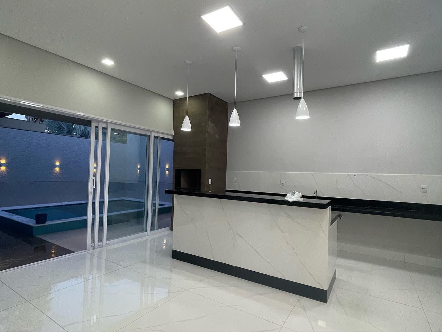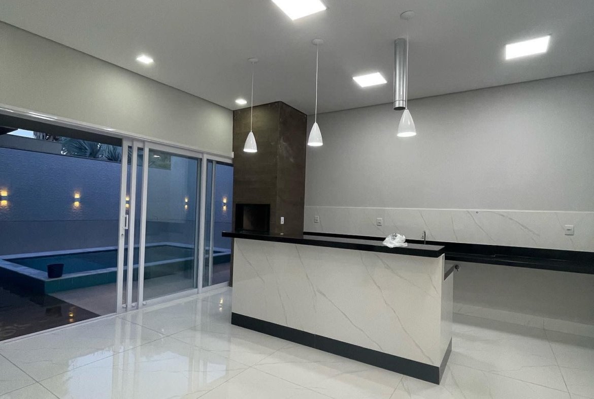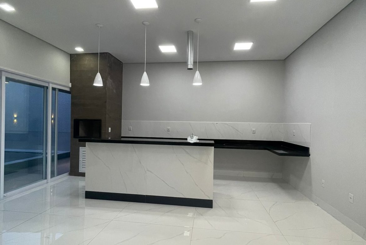 Espaço gourmet integrado com ilha e churrasqueira. Água quente na cozinha.