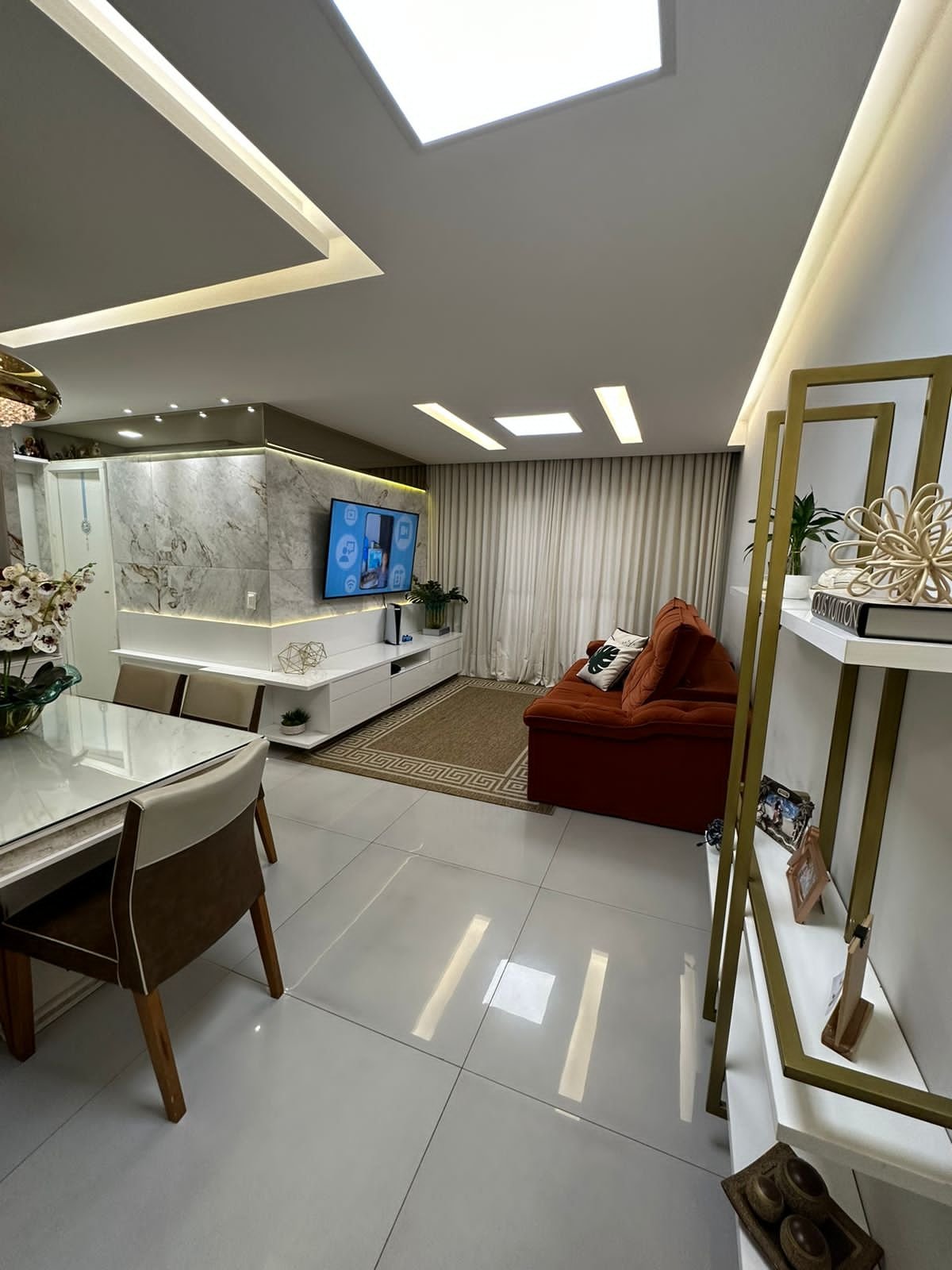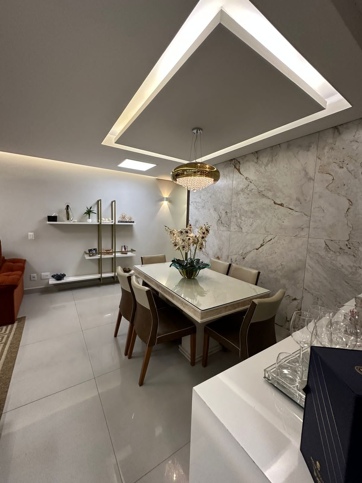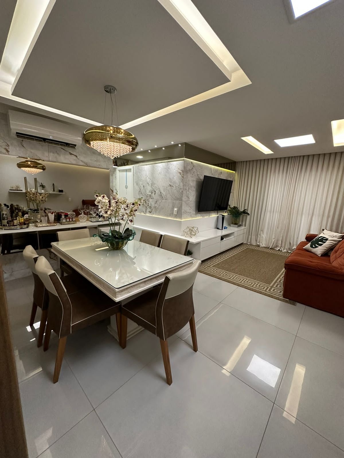 – Sala toda revestida de móveis + bar + porcelanatos na parede + lustre